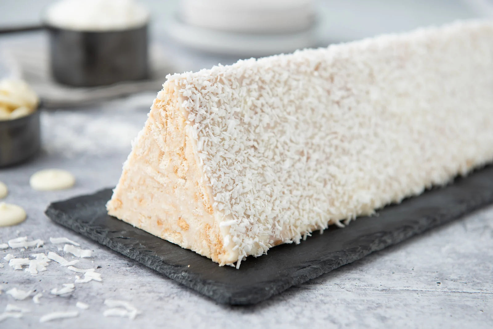 Experience the ultimate indulgence with our White Chocolate Mosaic Cake. Crushed butter cookies are folded into a heavenly blend of our signature white chocolate sauce, smooth crème pâtissière, and delicate coconut flakes. Topped with white chocolate ganache and delightful coconut macarons, each bite invites you to savor every moment.